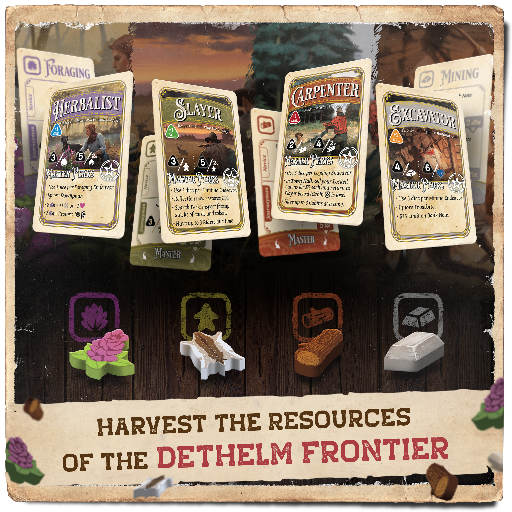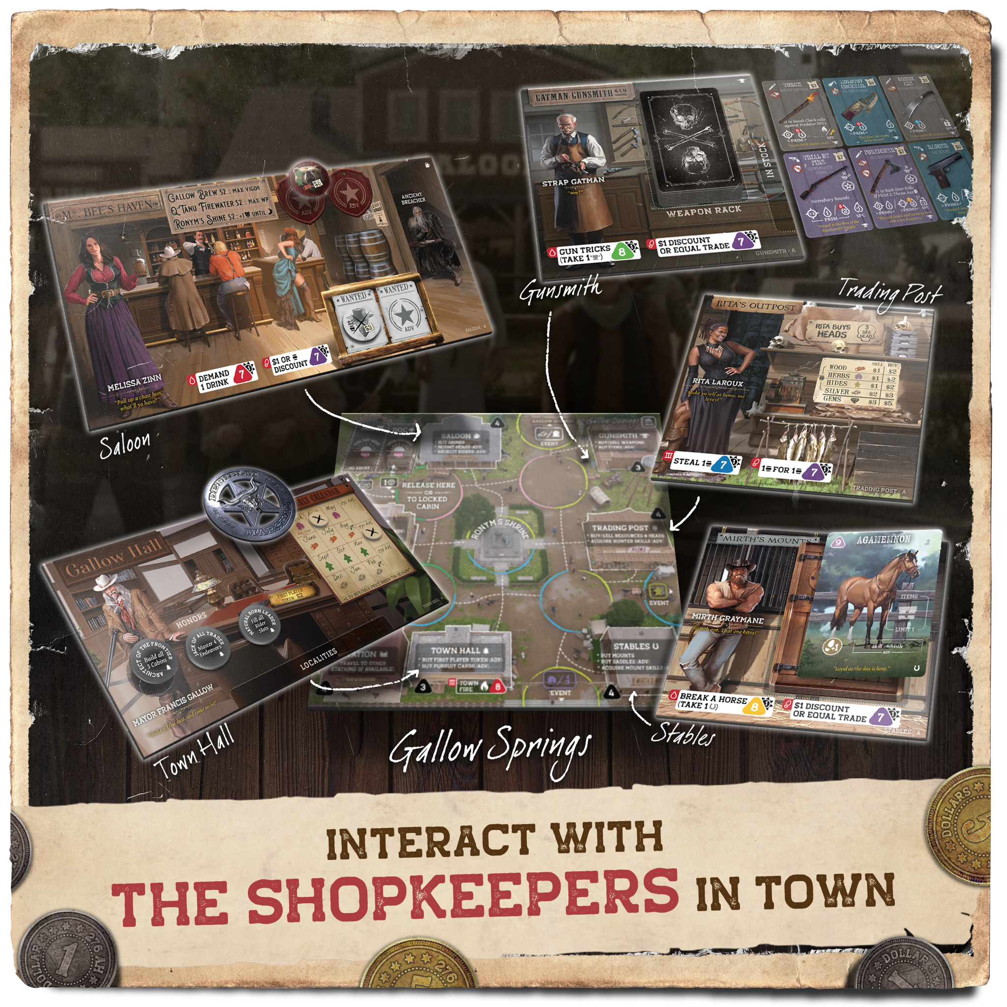 As you progress through each game mode, additional mechanics are revealed granting you more options and strategies. The introductory mode welcomes new players and warms them up to the way of life in Gallow Springs. Once you gain your footing, the town opens up and new opportunities arise in the standard mode. When its time for you to master your skills, explore the terrain after dark in the advanced mode. If you’ve mastered it all, create custom game modes using the modular game mechanics, components, and our written guide. Bantam West is the gift that keeps on giving.